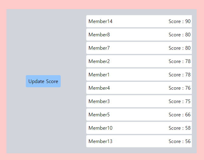 리더보드에서 이름, 점수를 표시하는 컴포넌트를 만들고 v-for로 다중생성하는 형태로 구성했다. `Transition`은 하나의 엘리먼트에만 적용할 수 있어서 사용할 수 없고, 대신 사용할 수 있는 `TransitionGroup`이 있다.